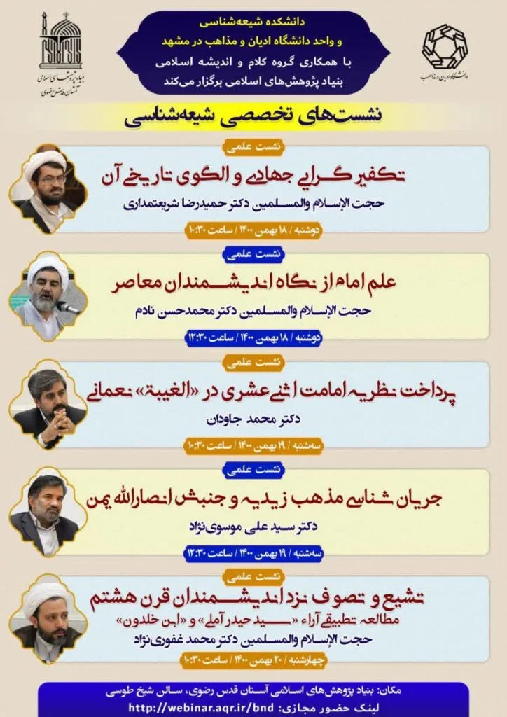 دانشکده شیعه شناسی و واحد دانشگاه ادیان و مذاهب در مشهد با همکاری گروه کلام و اندیشه اسلامی بنیاد پژوهش های اسلامی برگزار می کند. «سلسله نشست های تخصصی شیعه…