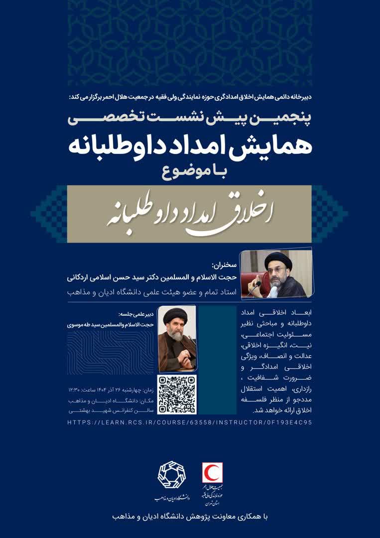 لازم به ذکر است پیش نشست تخصصی همایش امداد داوطلبانه روز چهارشنبه ۲۶ آذر ۱۴۰۴ ساعت ۱۳:۳۰ در سالن شهید بهشتی دانشگاه ادیان و مذاهب برگزار میگردد.