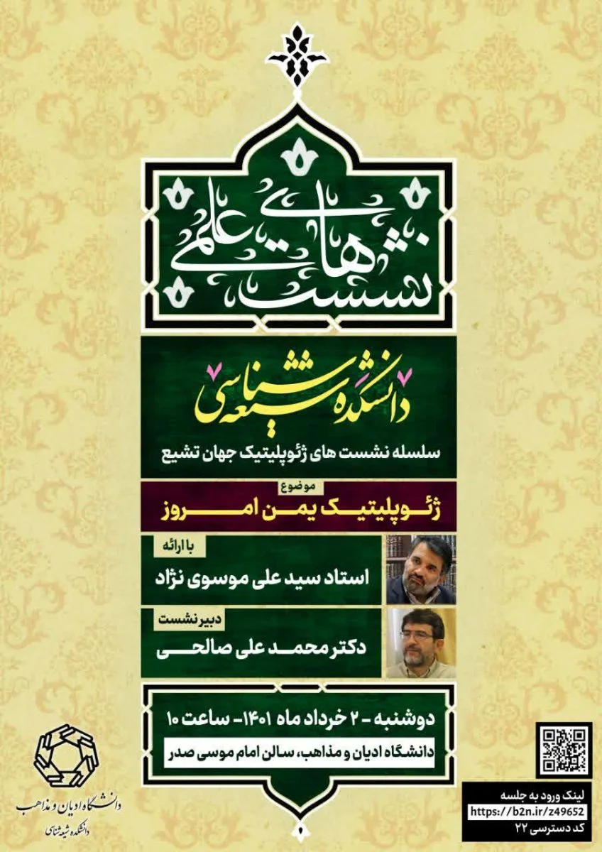 به همت معاونت آموزشی و پژوهشی دانشکده شیعه شناسی دانشگاه ادیان و مذاهب، نشست علمی «ژئوپلیتیک یمن امروز» با سخنرانی جناب استاد سید علی موسوی نژاد عضو هیئت علمی گروه تاریخ و فرق تشیع و دبیری جناب آقای دکتر محمد علی صالحی برگزار می شود.
