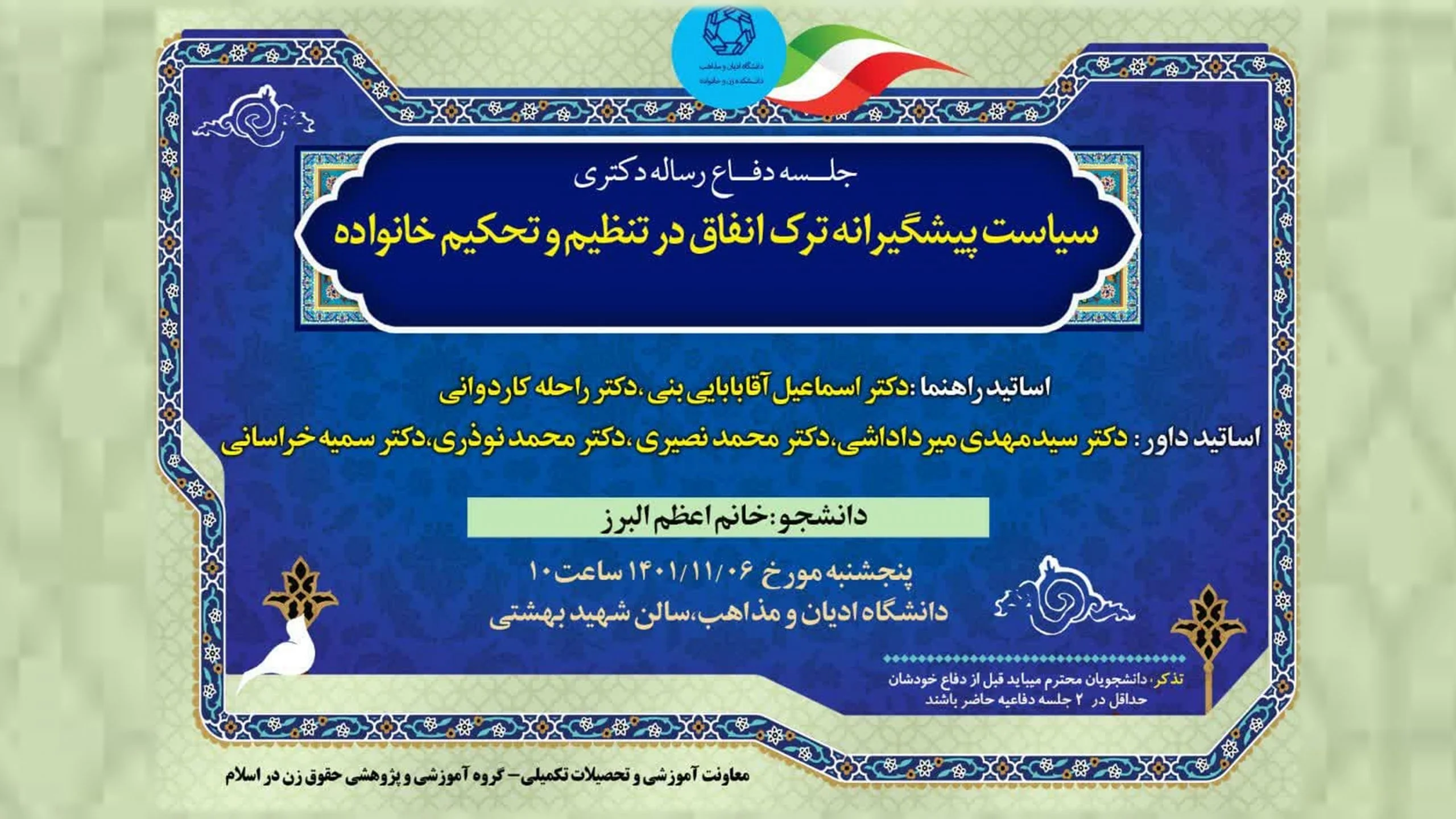 جلسه دفاع رساله خانم اعظم البرز دانشجوی دکتری رشته مطالعات زنان گرایش حقوق زن در اسلام