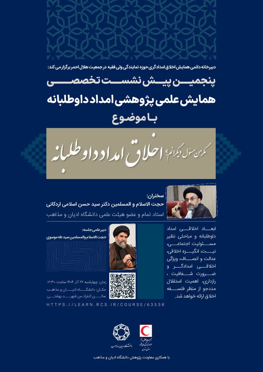 لازم به ذکر است پیش نشست تخصصی همایش امداد داوطلبانه روز چهارشنبه ۲۶ آذر ۱۴۰۴ ساعت ۱۳:۳۰ در سالن شهید بهشتی دانشگاه ادیان و مذاهب برگزار میگردد.